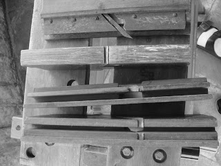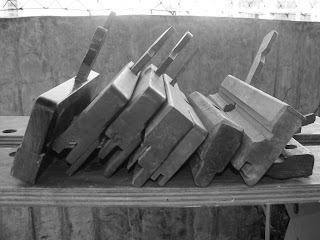 Eu decidi pular a etapa dos furos e dar uma limpeza nas peças, com auxílio da plaina (Lie Nielsen 5 1/2) e das rapadeiras. Como eu gosto de um "antes e depois", aqui esta o "antes"...