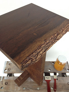 Pois parece, mas não é! Para tirar o verniz antigo que ficou na "casca" na lateral do tampo da mesa, usei um soprador industrial e uma escova de aço...